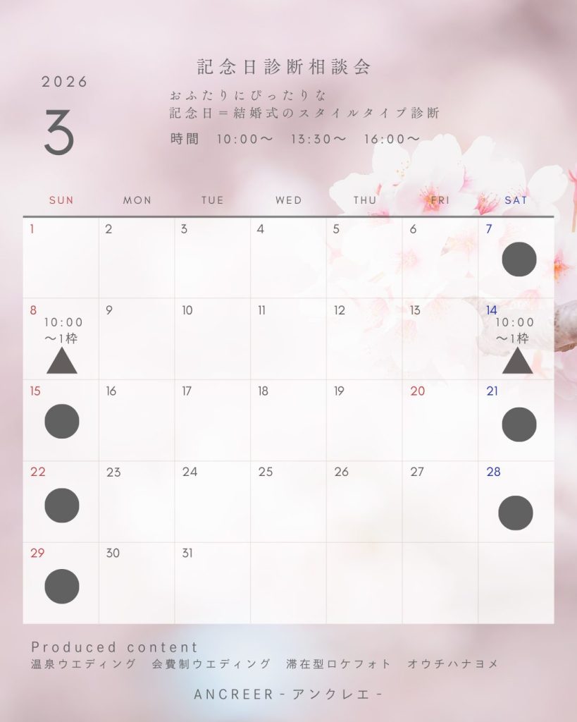 3月の開催日は下記カレンダーをご確認ください。現時点での空き状況となります。完全予約制ですので、ご希望の方はお問い合わせフォームよりお気軽にご予約ください。おふたりにお会いできるのを、楽しみにしております。